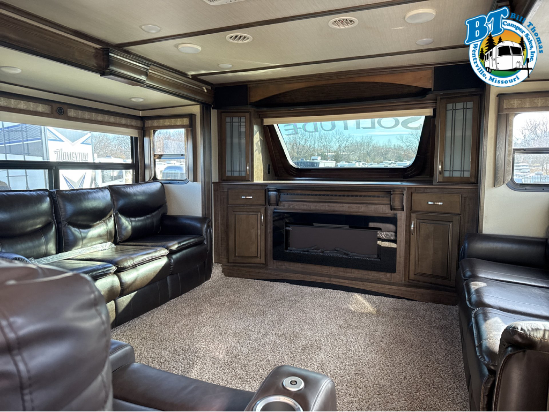 - Living Area: Telescoping LED TV, fireplace, power reclining theatre seating with heat and massage