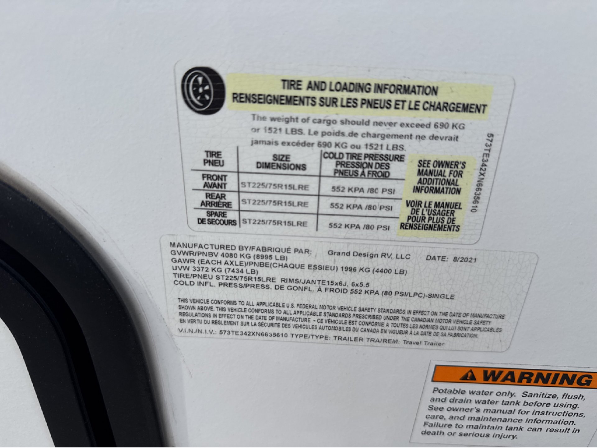 Fresh Water | 52 gals. | Grey Water | 90 gals. |